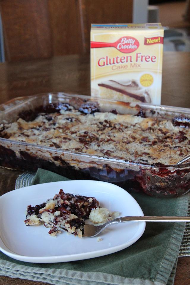 This recipe came about this weekend because we had our monthly support group potluck and I decided at the last minute that I was going to attend. Thus I needed to make something quick, and preferably from pantry staples. I rummaged around in the cabinet and found a Betty Crocker GF yellow cake mix hiding, so I put the call out on Facebook to get some ideas of what I could make with it. An old high school friend of mine suggested a dump cake. I had heard of them, but had never actually made one. So I rummaged around again in the cupboards and found a random can of peach pie filling. (Not something I usually keep around. Why I bought it in the first place, I don’t know, but it sure came in handy this weekend!)