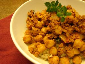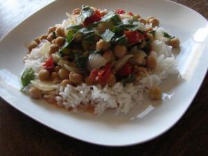 This is another of our tried and true recipes; the recipe card is well splattered. It also garnered a “very good” written on the top of the card. I am not sure where I originally found this recipe as I wrote it on a 3×5 card and did not note the source. I searched the internet for the same recipe and only found a few similar recipes but none that matched this exactly. The original recipe calls for more curry paste and fewer chickpeas than what I use. Below is my adaptation of this tasty recipe. We like to serve this over white basmati rice.